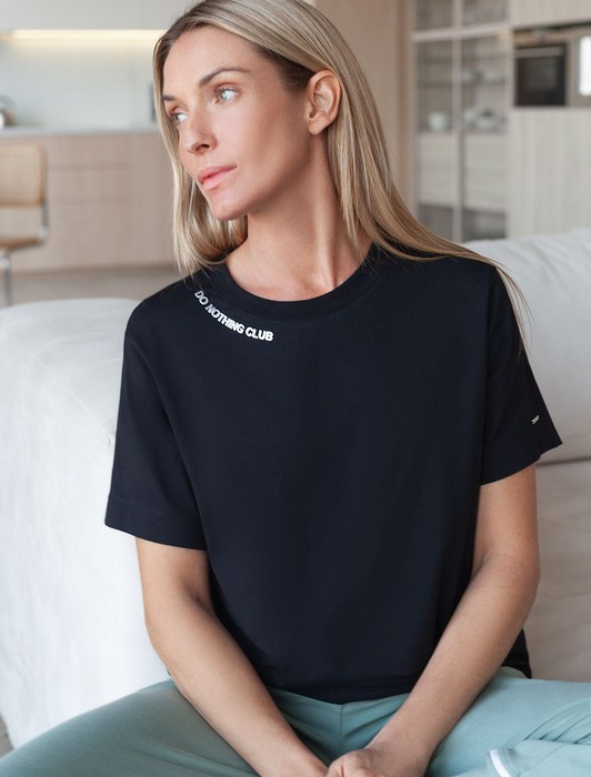 Состав: 92%Хлопок 8%ПУ Параметры модели на первом фото: Рост 172, бюст 88, талия 64, бедра 88Перевод принта: Do nothing club - клуб любителей отдыха. Футболка выполнена из премиального хлопка. Авторский принт нанесен фактурными красками с устойчивым покрытием. Наличие эластана в составе гарантирует комфорт и формоустойчивость. Изделие дополнено фирменным металлическим логотипом бренда.