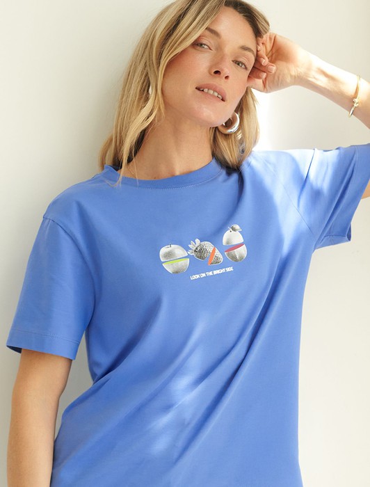 Состав: 92%Хлопок 8%ПУ Плотность: 170 Г/м2 Параметры модели на первом фото: Рост 172, бюст 88, талия 64, бедра 88Перевод принта: Look on the bright side - смотри на жизнь позитивно. Футболка выполнена из премиального хлопка. Авторский принт нанесен фактурными красками с устойчивым покрытием. Наличие эластана в составе гарантирует комфорт и формоустойчивость. Изделие дополнено фирменным металлическим логотипом бренда.
