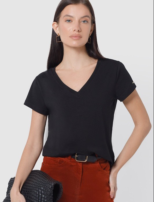 Состав: 92%Хлопок 8%ПУ Плотность: 170 Г/м2 Параметры модели на первом фото: Рост 170, бюст 89, талия 63, бедра 92Однотонная футболка с V-образным вырезом выполнена из премиального хлопка. Добавление эластана в состав изделия способствует формоустойчивости. Самое высокое качество длинноволокнистых хлопковых волокон обеспечивает комфорт в любое время года. Совет стилиста: очищенная от декора базовая модель будет уместна не только в повседневном образе с денимом, но и в офисе с нестрогим дресс-кодом, в паре с брюками и жакетом.