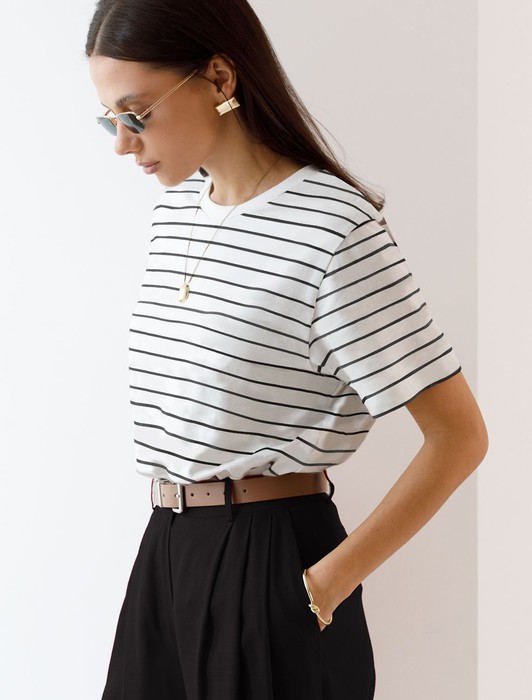 Состав: 92%Хлопок 8%ПУ Плотность: 170 Г/м2 Параметры модели на первом фото: Рост 170, бюст 83, талия 64, бедра 88Футболка выполнена из премиального хлопка. Наличие эластана гарантирует абсолютный комфорт и долговечность изделия. Модель в полоску предлагаем сочетать с однотонными вещами базовой палитры. Изделие дополнено металлическим логотипом бренда.