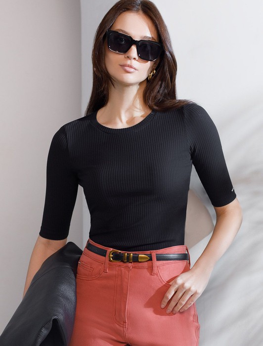 Состав: 95%Хлопок 5%ПУ Плотность: 230 Г/м2 Параметры модели на первом фото: Рост 172, бюст 88, талия 64, бедра 88 Размер товара на первом фото: 42Футболка выполнена из трикотажа в широкий рубчик. Базовая модель с круглым вырезом и рукавом до локтя. Эластичный хлопковый трикотаж сидит по фигуре, не сковывает движений и очень комфортный в носке. Фактура вертикальных полос визуально стройнит и вытягивает силуэт. Базовое изделие хорошо впишется в любой гардероб. Идеально подходит для многослойных образов в базовый гардероб.