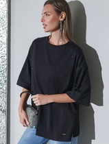 Футболка молодежная их трикотажного полотна кулирка» в полоску, свободная, с втачными рукавами, горловиной овальной формы, обработанной притачной бейкой из основного материала. Полочка и спинка с двумя небольшими косыми кокетками и отделочным кантом в швах соединения кокеток с основными деталями, кант из контрастного материала.