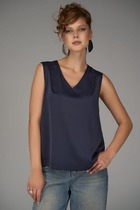 Майка – из полотна «кашкорсе» на широких бретелях. Горловина и проймы окантованы основным материалом.