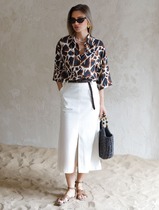 Футболка из гладкокрашеного трикотажного полотна «кулирка» с эффектом «варенки», свободного покроя, горловиной овальной формы, обработанной притачной планкой. Низ рукавов и изделия состоит из двух частей, одна из которых с необработанным краем, другая с подгибкой и соединенных между собой накладным швом.