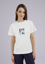 Футболка из гладкокрашеного трикотажного полотна «кулирка» с эффектом «варенки», свободного покроя, горловиной овальной формы, обработанной притачной планкой. Низ рукавов и изделия состоит из двух частей, одна из которых с необработанным краем, другая с подгибкой и соединенных между собой накладным швом.
