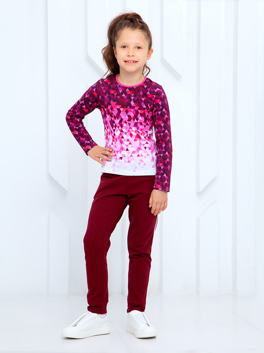 Дизайнерский рисунок идеально вписался в футболку с длинным рукавом и округлым окантованным вырезом.Изделие подходит накаждый день и к нему можно подобрать Бомбер или Толстовку.
