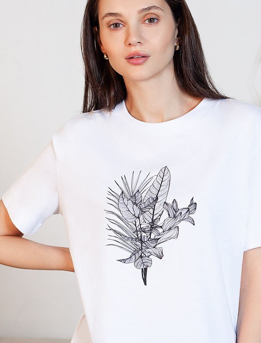 Состав: 100%Хлопок Плотность: 140 Г/м2Футболка белого цвета выполнена из премиального 100% хлопка плотностью 140 Г/м2. Главная особенность этого изделия — тонкое кулирное полотно, которое легче и воздушнее стандартного варианта. Благодаря своей деликатной текстуре футболка идеально подходит для домашних образов и пижамных комплектов. Ткань отлично дышит, обеспечивая максимальный уют во время сна и отдыха. Особое внимание привлекает стильный принт контрастного цвета в виде тропических растений. Принт выполнен красками с устойчивым покрытием, который добавляет изделию оригинальности и позволяет выразить индивидуальность. Свободный крой футболки дарит удобство и не стесняет движений, что делает ее идеальной для повседневной носки или активного отдыха, подчеркивает современный взгляд на моду. Подойдет девушкам и женщинам на любую фигуру, вы будете чувствовать себя в ней уверенно и комфортно. Лаконичный современный принт делает изделие универсальным: можно создавать стильные образы для прогулок, встреч, занятий спортом и домашних дел. Базовая футболка подходит для любой ситуации и сочетается с разными элементами гардероба.