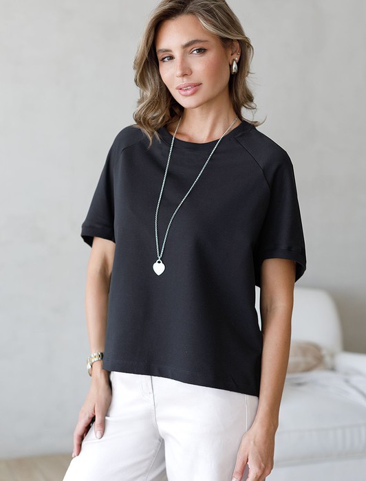Состав: 95%Хлопок 5%ПУ Плотность: 240 Г/м2 Параметры модели на первом фото: Рост 172, бюст 88, талия 64, бедра 88Футболка черного цвета свободного кроя выполнена из премиального футера двухнитки с эластаном плотностью 240 Г/м2. . Натуральный материал отличается мягкостью и приятной текстурой, позволяя коже дышать и обеспечивая максимальное удобство при носке. Наличие эластана в составе изделия гарантирует абсолютный комфорт и формоустойчивость. Круглый ворот, рукава регланы средней длины и спущенная линия плеча придают футболке стильный и современный вид, делают образ расслабленным и непринужденным, такой вариант отлично сядет на большие размеры. Плотная футболка идеально подходит для повседневной носки и незаменима для тех, кто ценит удобство и свободу движений без компромиссов по стилю.
