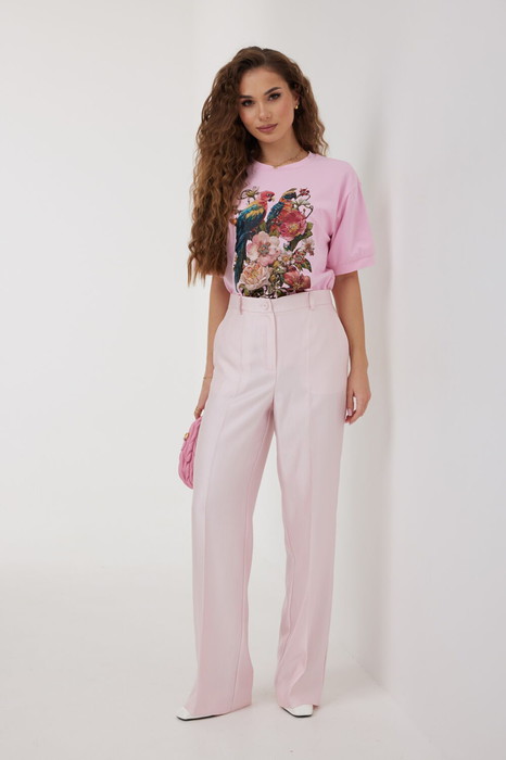 Джемпер прямого силуэта из трикотажного полотна. Горловина круглой формы с бейкой. Расширенная линия плеча. Рукав короткий по низу с манжетой. Перед декорирован печатью.