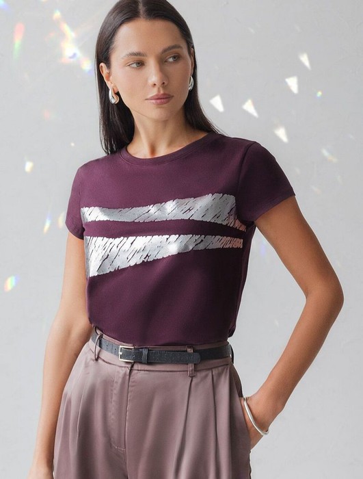 Футболка цвета бургунди идеально подходит для вечеринки и создания яркого образа. Оригинальный принт из ярких пайеток в виде рыбки придает изделию шикарный вид, который привлечет внимание на любом мероприятии. Модель с круглым вырезом и классическим коротким рукавом обеспечивает свободу движений и комфорт в носке. Такой фасон изделия подходит на большие размеры, гармонично сидит на фигуре и помогает создать легкий акцент на достоинствах. Аккуратный круглый вырез красиво подчеркивает шею и делает образ элегантным, сохраняя актуальность для разных случаев — от рабочих встреч до вечерних прогулок и праздничных мероприятий.