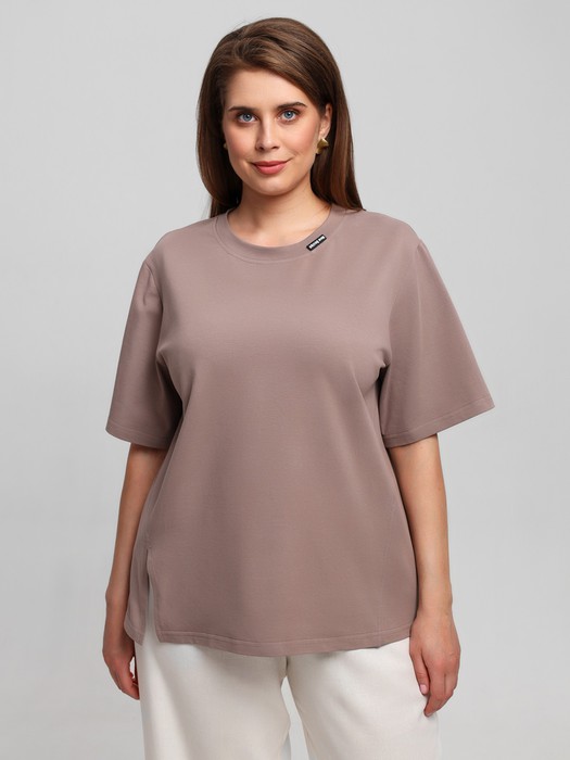 Футболка женская из гладкокрашенного трикотажного полотна «кулирка», свободного силуэта, с боковыми швами, переходящими в рельефы, в правом соединительном шве выполнен разрез. Горловина овальной формы обработана втачной планкой и дополнена декоративным элементом.
