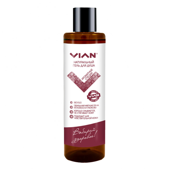 Натуральный экологичный гель для душа VIAN не содержит агрессивных ПАВ, сульфатов (SLS, SLES). В его составе только мягкие растительные ПАВ из кокоса и глюкозы, которые деликатно очищают, не сушат кожу и подходят даже для чувствительной и детской кожи. Особые природные компоненты в составе геля для душа VIAN препятствуют стягиванию кожи после мытья. Гель отлично смывается с кожи, не оставляя ощущения остаточной плёнки.