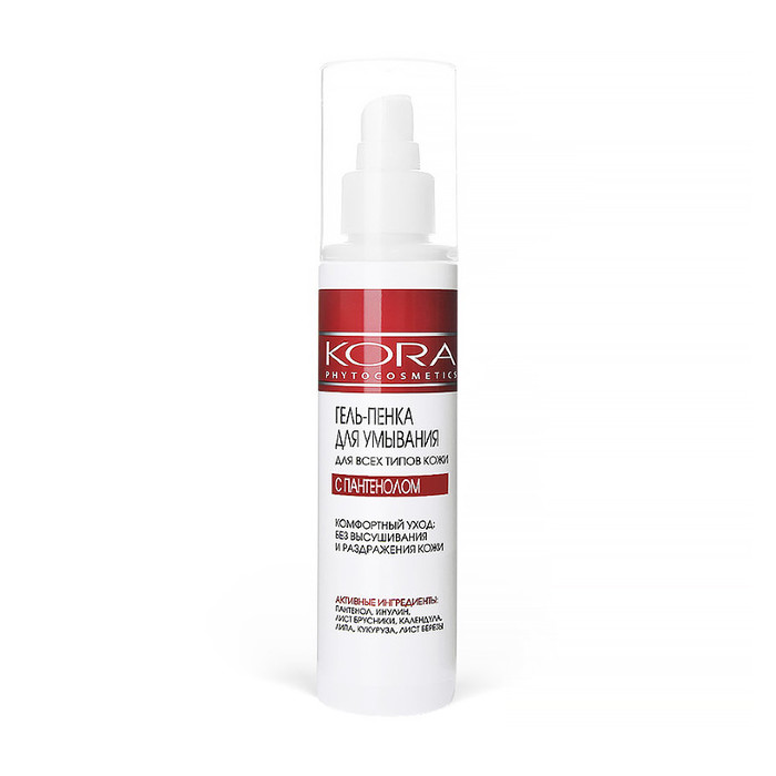 Гель-пенка для умывания с пантенолом от KORA имеет приятную легкую текстуру и нежный аромат. Она создана для деликатного очищения кожи лица и шеи и для снятия декоративной косметики.Благодаря натуральным компонентам в составе, средство не пересушивает кожу, не раздражает и не стягивает ее, не доставляет других дискомфортных ощущений.Гель-пенка для умывания подойдет для любого возраста и типа кожи, особенно для проблемной, жирной и комбинированной. Мягкая гелевая консистенция пенки позволяет максимально бережно, но при этом тщательно очистить кожу от загрязнений и косметики, не провоцируя сухости и покраснений, и подготовить лицо к нанесению уходовых средств.Инулин (натуральный полисахарид, который получают из цикория) и пантенол в составе пенки дарят коже интенсивное увлажнение, компенсируя недостаток влаги и ценных веществ в клетках кожи, а также дают смягчающий и восстанавливающий эффект. Натуральные экстракты растений действуют как мощное бактерицидное средство, а также освежают кожу и приводят ее в тонус, успокаивают и помогают убрать шелушения.Гель-пенку KORA с пантенолом можно использовать даже для снятия макияжа с глаз. Но для удаления водостойкой косметики рекомендуется применять ее в паре со средством, предназначенным специально для этого.Активные ингредиенты: Пантенол, инулин, лист брусники, календула, липа, кукуруза, лист березы.Применение: Сделать одно или два нажатия на дозатор, хорошо вспенить гель в ладонях и распределить по влажной коже лица, шеи и области декольте. Деликатно помассировать круговыми движениями, уделяя особенное внимание участкам, на которые нанесен макияж, и смыть большим количеством воды. При необходимости повторить процедуру. Далее нанести тоник и крем или эмульсию, соответствующие вашему типу кожи.