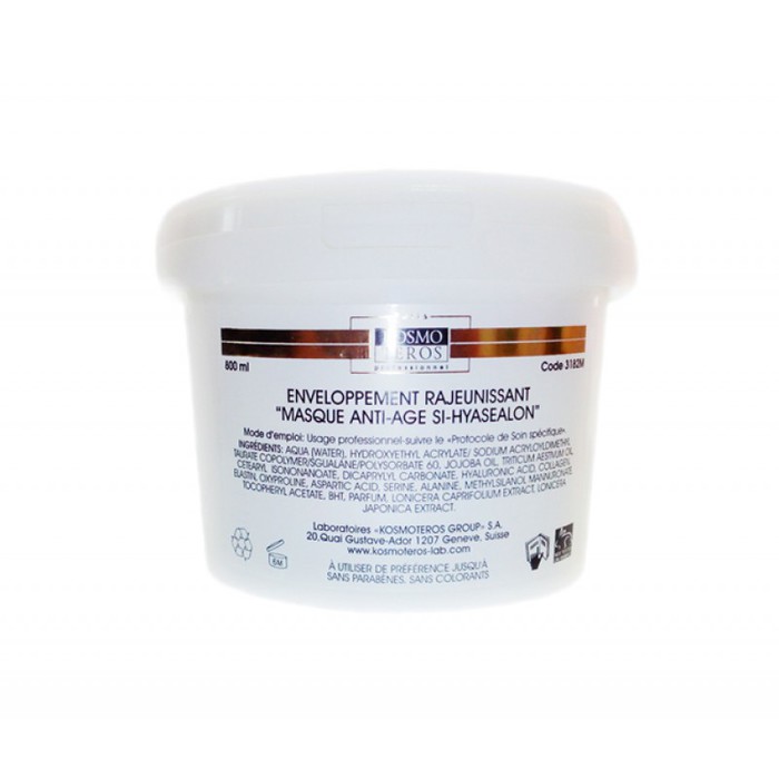 Гелевое омолаживающее обертывание. Благодаря наличию пептидно-полисахаридного комплекса Si-Hyasealon, содержащего различные модификации гиалуроновой кислоты, коллагена, эластина, а также органически связанного кремния, обертывание Маска anti-age Si-Hyasealon от Kosmoteros препятствует преждевременному старению и поддерживает необходимый уровень увлажнения кожи, активизирует систему структурообразующих компонентов дермы, повышает упругость и эластичность кожи.