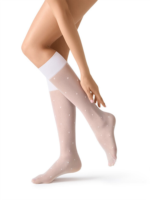 Женские полуматовые эластичные гольфы 20 den с рисунком «горошек». Удобная резинка «ТОП комфорт» обеспечивает превосходное облегание - гольфы отлично ощущаются на ноге. Невидимый усиленный мысок отлично сочетается с легкой, открытой обувью - босоножками балетками и туфлями.