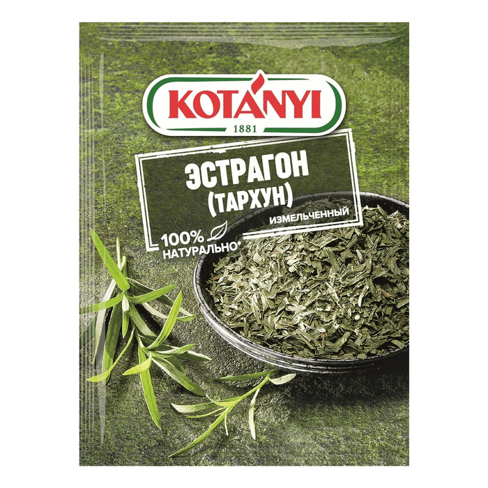 Эстрагон тархун Kotanyi измельченный, 7г - высушенные и измельченные листья растения. Представленная специя отличается приятным пряным вкусом и широко применяется в кулинарии. Ее второе название - тархун. В кухнях разных стран его используют при приготовлении блюд из мяса: говядины, свинины, баранины и субпродуктов. Его также принято добавлять в первые блюда: бульоны, овощные супы и окрошку. Такая специя уместна в свежих салатах, закусках, гарнирах. Ее используют при засолке овощей и грибов, приготовлении маринадов, квашении капусты и даже замачивании фруктов: яблок и груш. Всего щепотка эстрагона придает пикантный привкус всему блюду. Часто представленную специю применяется для настаивания алкогольных напитков, например, водки. А еще из нее готовят известный во всем мире одноименный напиток «Тархун», отличающийся освежающим вкусом. Данное растение полезно за счет высокого содержания в его листьях эфирного масла, а также витамина С, каротина и кумарина. Эстрагон обладает общеукрепляющим действием, улучшает пищеварение, повышает аппетит. Он улучшает состояние нервной системы и нормализует метаболизм.
