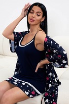Насыщенно-синий халат из вискозы с красными цветами и белыми полосками. Длина чуть выше колен, рукава короткие, на пуговицах, сбоку имеются карманы. Размерный ряд от 44 до 54. Имеется возможность розничного приобретения.