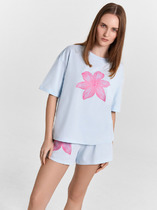 Халат молодежный из кулирки с яркой окантовкой. Застежка на молнию, короткий рукав, карманы, капюшон, в боковых швах поясок,  на полочке сверху пришивная аппликация.