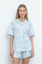 Халат женский прямого силуэта с втачными рукавами на манжете длиной 3/4. V-образный вырез горловины с воротником стойкой и центральной застежкой на пуговицы.