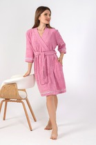 Халат женский из гладкокрашенного трикотажно полотна «кулирка» с меланжированным эффектом. Полуприталенного силуэта, с короткими рукавами покроя «реглан» и горловиной овальной формы, окантованной основным материалом, с центральной бортовой застежкой на тесьму «молния». По срезу горловины выполнены неглубокие складки, нижние резы рукавов обработаны притачными манжетами. На полочке принт, выполненный в технике «шелкографии».