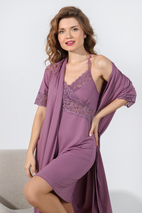 Халат молодежный из гладкокрашеного трикотажного полотна, на запахе, с короткими втачными рукавами, отделанными кружевом по нижним срезам, со съемным поясом, завязывающимся на талии и продетым в две шлевки в ботовых швах. Бортовые срезы и горловина обработаны притачной планкой.