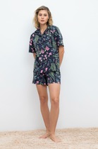 Халат женский из трикотажного полотна «кулирка» с набивным рисунком полуприлегающего силуэта, с горловиной овальной формы, окантованной основным материалом, короткими втачными рукавами с притачными манжетами. В боковых швах, смещенных в сторону полочки, обработаны карманы.