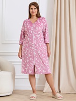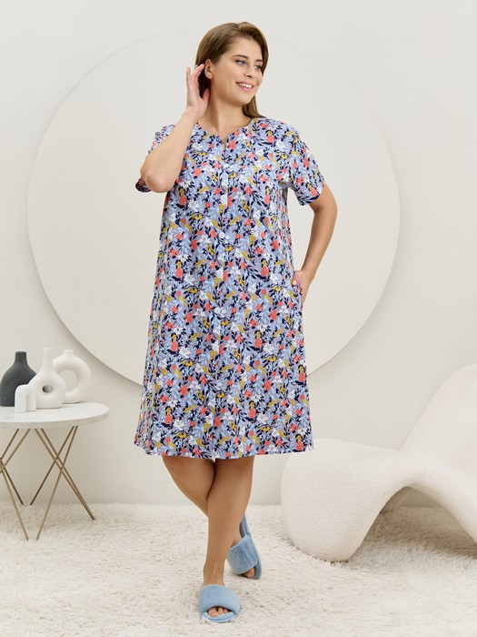 Халат женский из трикотажного полотна «кулирка» с набивным рисунком, прямого силуэта, с короткими втачными рукавами, карманами в боковых швах и центральной бортовой застежкой на обметанные петли и пуговицы. Горловина – овальной формы, переходящая в небольшой v-образный вырез выше верхней пуговицы. Входы в карманы и горловина спинки окантованы.