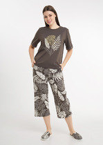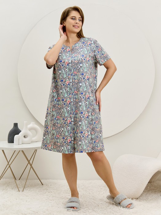 Халат женский из трикотажного полотна «кулирка» с набивным рисунком, прямого силуэта, с короткими втачными рукавами, карманами в боковых швах и центральной бортовой застежкой на обметанные петли и пуговицы. Горловина – овальной формы, переходящая в небольшой v-образный вырез выше верхней пуговицы. Входы в карманы и горловина спинки окантованы.