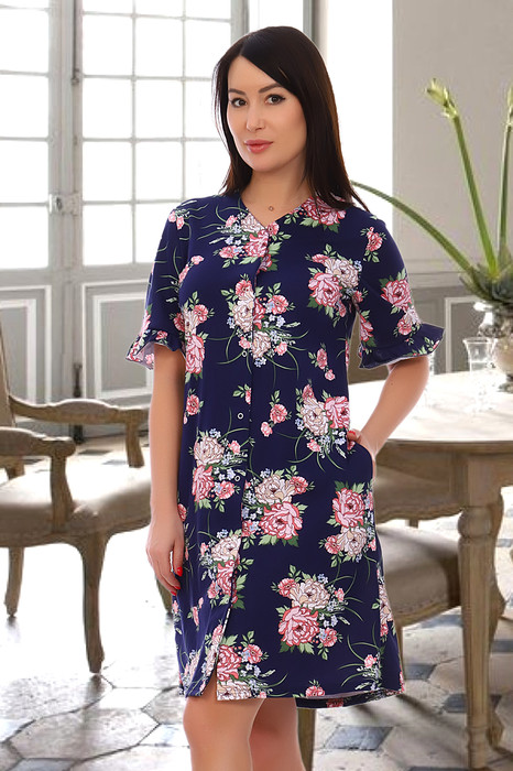Халат женский свободного силуэта на кнопках, в боковом шве имеются два внутренних кармана. Рукав втачной 3/4, обработан воланом. Длина чуть выше колена.