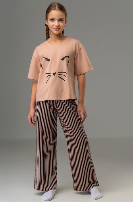 Детская пижама для девочки и девочки подростка — отличный выбор для сна и отдыха. Чёрная футболка со спущенным плечом украшена принтом Усы и ушки котика, а штаны дополнены атласным бантом на поясе и рисунком в полоску.