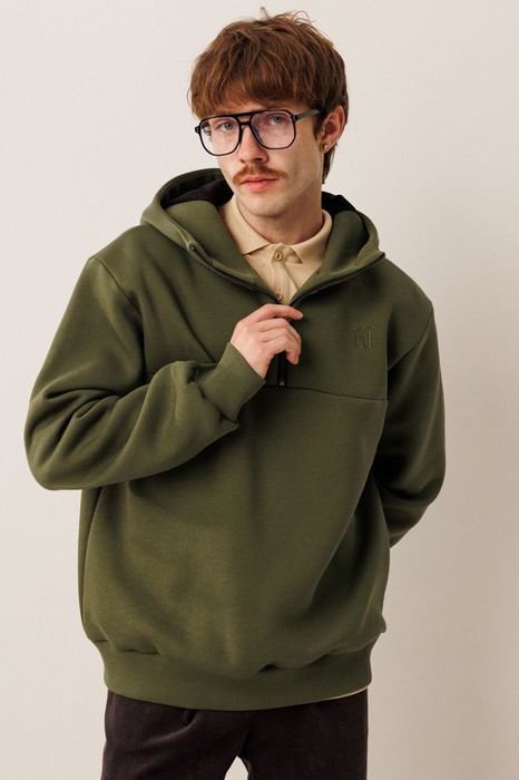 Этот джемпер от GOwear отлично подойдет для дома, прогулок, путешествий и отдыха. Сделан из теплой, комфортной ткани. Джемпер имеет  двойной капюшон и короткую застежку - молнию черного контрастного цвета по центру переда. На переде с левой стороны выполнена вышивка в цвет ткани, а также расположена горизонтальная кокетка. Джемпер имеет прямой силуэт. Низ джемпера и манжеты выполнены из кашкорсе.