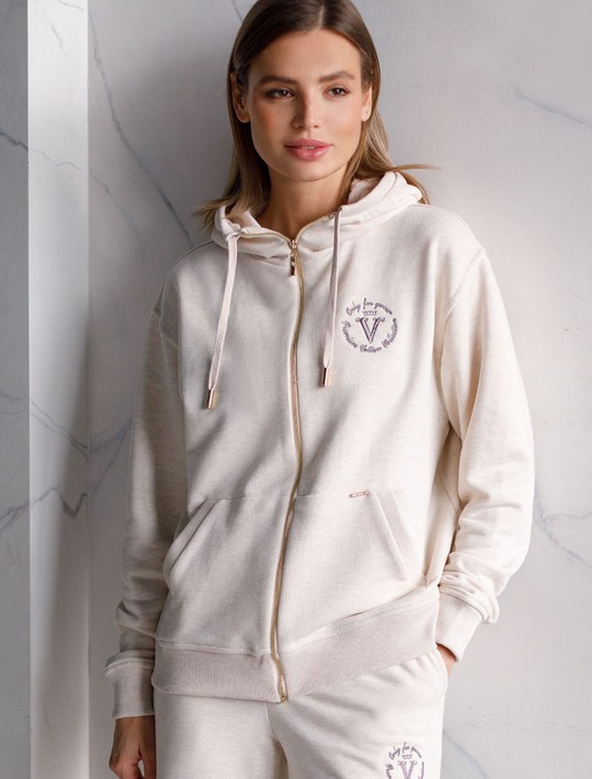 Состав: 80%Хлопок 20%ПЭ Параметры модели на первом фото: Рост 172, бюст 88, талия 64, бедра 88Худи на молнии с золотистой фурнитурой выполнено из премиального футера трехнитки без начеса. Изделие украсили принтом в виде логотипа бренда. Мягкий и уютный трикотаж с добавлением эластана гарантирует абсолютный комфорт даже в прохладное время года, не ограничивая свободу движений. Модель сочетается в костюме с брюками D44.079 и D44.089