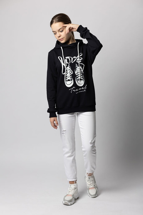 Женское худи. Состав: Футер 2-х ниточный, 75% хлопок, 20%  полиэстер, 5%  лайкра. Особенности: Втачной капюшон внахлёст; Принт Кеды Love; Карманы без молнии в боковых швах; Эластичный манжет по низу рукава и изделия. Таблица размеров и ростов Размер 36 38 40 42 44 Обхват груди, см 64-66 68-70 72-74 76-78 80-82 Рост, см 134-140 140-146 146-152 152-158 158-164
