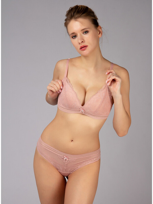 Бюстгальтер из полиамида, розового цвета, без косточек, без Push-up, с тонкой подкладкой, с кружевными вставками и обрамлением, на поясе из микросетки, на тонких регулируемых лямках.