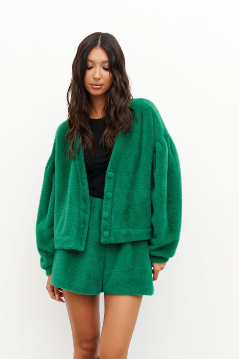 Кардиган свободного кроя выполнен из мягкого фактурного полотна зеленого цвета. Характеристики: свободный крой, горловина V образный вырез, застежка центральная петли пуговицы декорированые тканью основного изделия, рукав объёмный, спущен, по низу рукава манжета. Длина изделия 51 см , длина рукава 71 см от края горловины.