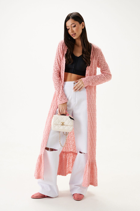 Кардиган. Выполнен их вязаного трикотажа. Свободный крой. Вырез горловины V-образный. Рукав втачной. Застёжка центральная пуговицы. По низу волан со сборкой. Длина рукава от линии втачивания 66 см. Длина спинки 132 см