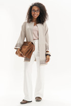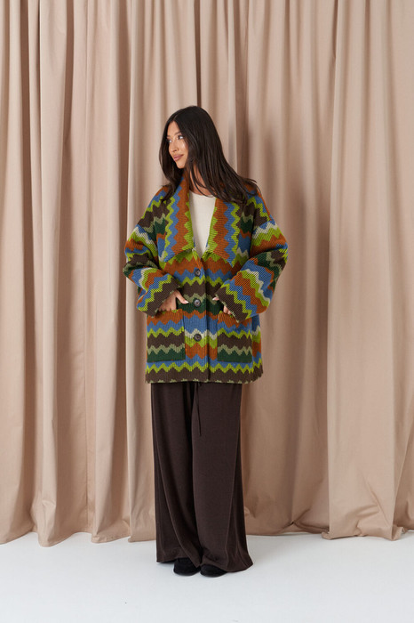 Жакет прямого свободного кроя, выполнен из полотна трикотажа крупной вязки. Характеристика: жакет прямого кроя, отложной воротник, центральная застежка на петли-пуговицы, по переду изделия два накладных кармана,брендированная подкладка, рукав свободный, линия плеча спущена, спинка цельнокройная. Длина рукава от края горловины 76см, длина изделия по спинке о края горловины 81см.