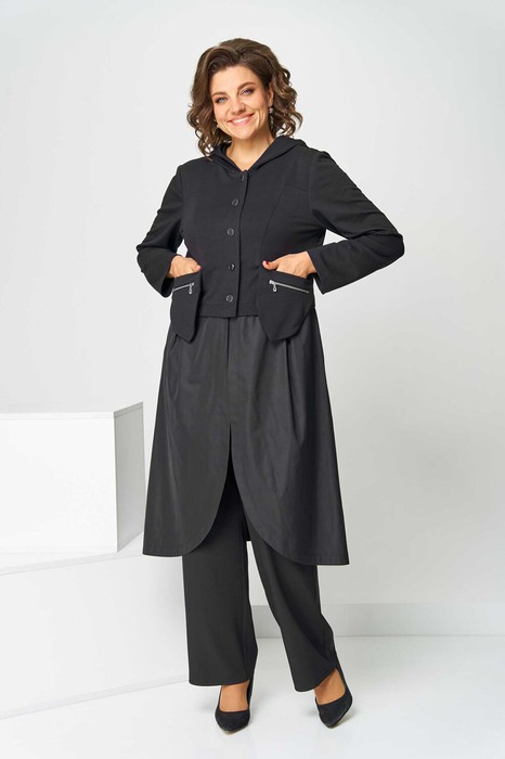 Кардиган комбинированный из трикотажа и плащевой ткани полуприлегающего силуэта, с центральной застежкой на петли-пуговицы. Вверху капюшон. Спинка с талиевыми вытачками. Перед с карманами и тесьмой-молнией, входящими в подрез бочка. Рукав вточной одношовный.