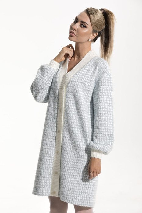 Кардиган объемный, прямого силуэта, с центральной застежкой на петли и пуговицы. По борту полочек и горловине спинки- отрезная планка. Кардиган без боковых швов, плечо спущенное. Рукав втачной, с отрезной манжетой.