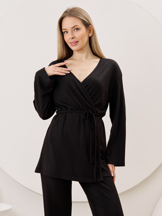 Кардиган-кимоно женский из гладкокрашенного трикотажного фактурного полотна в «рубчик» с добавлением ангоры, на запахе, прямого силуэта, с длинными втачными рукавами. Нижние срезы рукавов, так же низ изделия-обработаны подгибкой, борта полочки и горловина окантованы основным материалом. Изделие укомплектовано съемным поясом, вытачанным из окантовки.