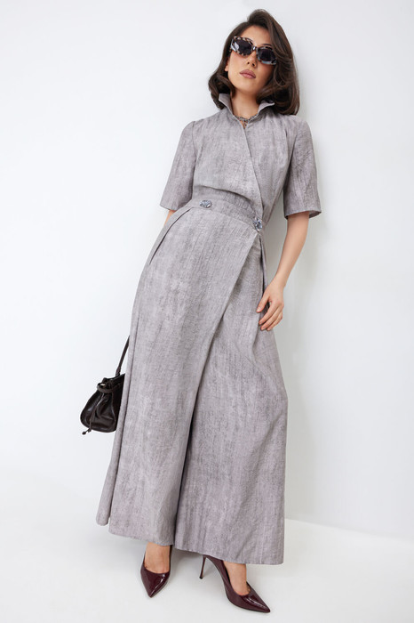 Комбинезон женский, отрезной по линии талии. Верхняя часть с рельефами по переду и вытачками по спинке, что обеспечивает стройность фигуры. Воротник стояче-отложной. Застежка на запах с петлями, пуговицами и потайной магнитной кнопкой обеспечивает практичность и легкость в использовании. Рукав втачной, короткий. Нижняя часть комбинезона оформлена складками и имитацией запаха, что добавляет модели свободы движений. В боковых швах расположены карманы. По спинке на уровне талии есть резинка для хорошей фиксации. Этот комбинезон идеально подходит для повседневной носки и разнообразных образов, сочетая модный стиль, комфорт и практичность.