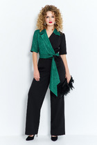 Комбинезон женский выполнен из тканей компаньонов. Изделие на запах, отрезное по линии талии. Горловина с отложным воротником. Рукав втачной до локтя . Брюки комбинезона классические, прямые от бедра. В боковых швах брюк имеются функциональные карманы. В комплектацию входит съемный длинный пояс из основной и отделочной ткани.