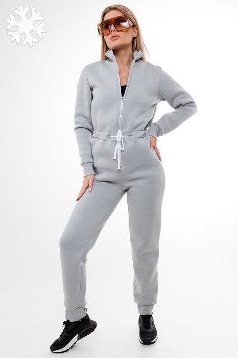 Уютный, женственный комбинезон полуприлегающего силуэта из футера с начесом. Манжеты рукавов, манжеты брюк, стойка из ткани компаньона в цвет. Комбинезон с застежкой молнией по центру, с вышивкой логотипом в цвет на левом переде. Силуэт приталенный - за счет резинки по спинке и завязок на переде. Брюки с удобными боковыми карманами.