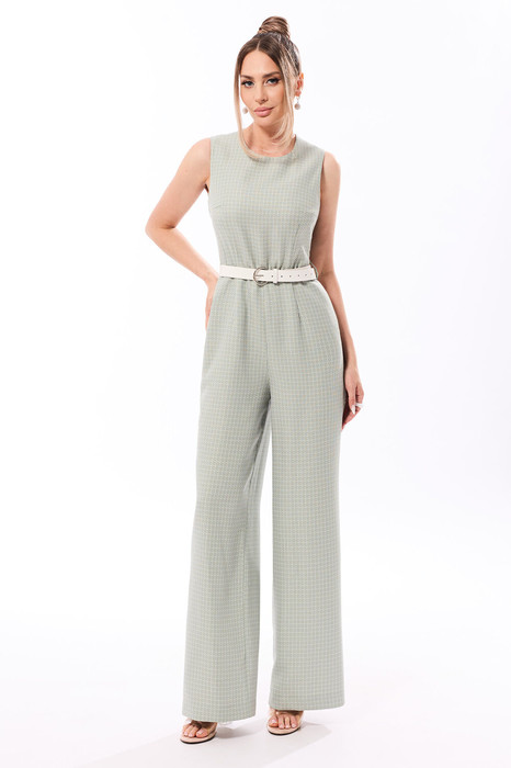 Комбинезон с застежкой на потайную молнию с среднем шве спинки, без рукавов. По верхней части переда нагрудные и талиевые вытачки. В боковых швах нижней части комбинезона выполнены карманы . Спинка со средним швом, талиевыми вытачками. Шов по талии присборен на резинку. Комбинезон со съемным поясом. По боковым швам расположены шлевки для пояса.
