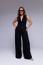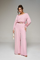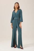 Комбинезон полуприлегающего силуэта с расширенными книзу брюками из струящейся ткани. Комбинезон отрезной по линии талии на резинке, верхняя часть комбинезона на запах. Рукав втачной, длинный, по низу манжета с застежкой на петлю  и пуговицу. На спинке в среднем шве  застежка на потайную молнию. В боковых швах карманы. В комплект входит пояс. Обращаем ваше внимание, что фурнитура может отличаться от фото.