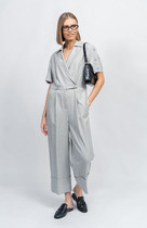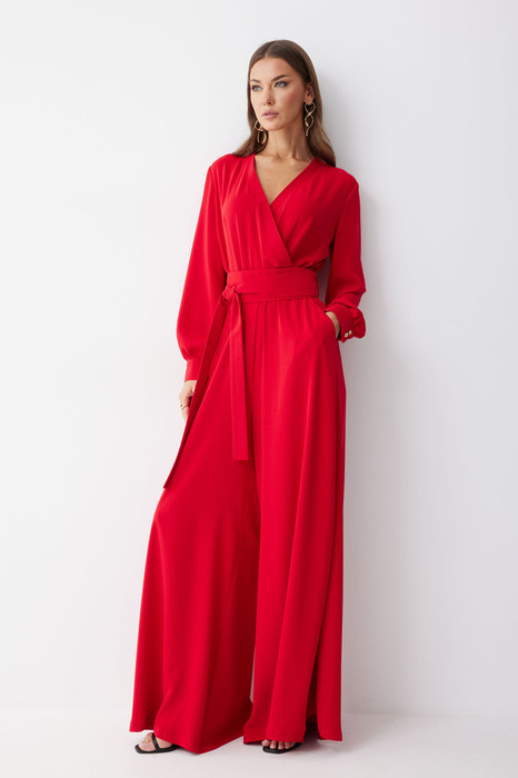 Комбинезон полуприлегающего силуэта с расширенными книзу брюками из струящейся ткани. Комбинезон отрезной по линии талии на резинке, верхняя часть комбинезона на запах. Рукав втачной, длинный, по низу манжета с застежкой на петлю  и пуговицу. На спинке в среднем шве  застежка на потайную молнию. В боковых швах карманы. В комплект входит пояс. Обращаем ваше внимание, что фурнитура может отличаться от фото.