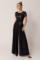 Комбинезон полуприлегающего силуэта. Комбинезон отрезной по линии талии. Лиф переда и спинки с рельефами. В среднем шве спинки вставлена потайная тесьма-«молния». Брюки длинные, широкие. По задним половинам брюк талиевые вытачки. По передним половинам односторонние складки. В боковые швы вставлены отлетные детали, которые переходят в завязки вокруг шей.
