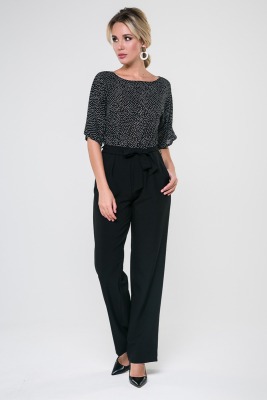 Стильный комбинезон свободного силуэта из шифона и костюмного полотна. Комфортную посадку на талии обеспечивает эластичная резина. Вырез горловины по спинке V-образный. В среднем шве спинке расположена застежка на потайную молнию. Короткий цельнокроеный рукав. В боковых швах брюк выполнены функциональные карманы с отрезным бочком. На талии по бокам закреплены шлевки под пояс. Удобный комбинезон подойдет для прогулок и приятных встреч.