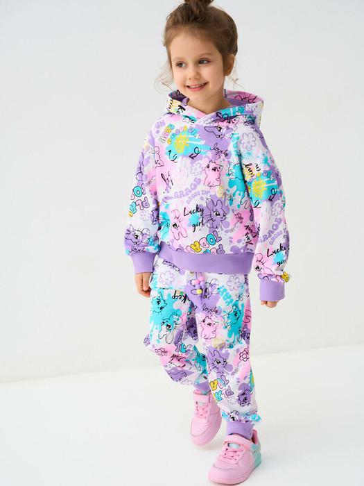 Детский спортивный костюм для девочки. Комплект выполнен из хлопкового футера и состоит из худи и джогеров на резинке. Толстовка свободного кроя с капюшоном. Манжеты и пояс выполнены из эластичного риба, благодаря чему изделие хорошо держит форму. Брюки джоггеры — комфортные, с эластичным поясом и шнуром для регулировки посадки. Удобные боковые карманы. Низ штанин собран на резинку.