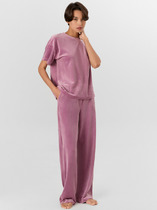 Брюки с посадкой на талии свободного силуэта. Пояс цельнокроеный с резиной внутри. Низ изделия застрочен швом в подгибку.